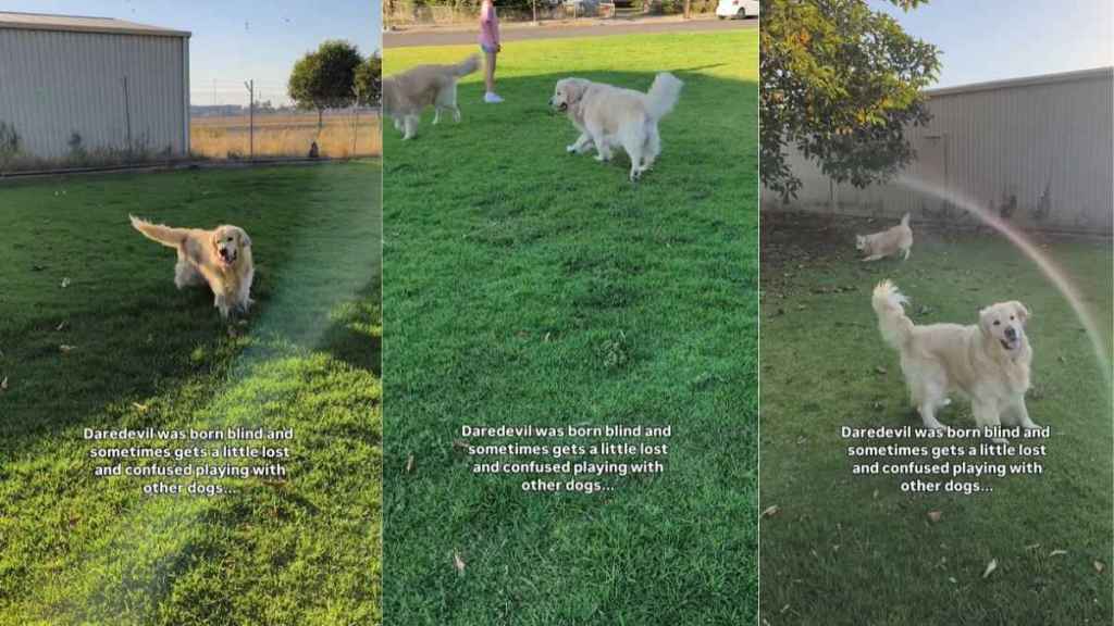 One of his buddies eventually swoops in to grab the toy, but Daredevil just stands there with a massive grin, looking toward his human’s voice. The in-video text reads, “ Daredevil was born blind and sometimes gets a little lost and confused playing with other dogs…” but as his owner says, his “tail always wagging though.”