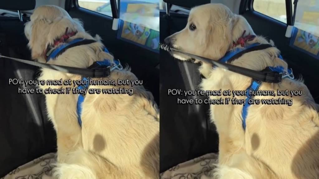The video’s onscreen caption explains the angry Golden Retriever’s sentiments: “POV: you’re mad at your humans, but you have to check if they are watching.” Meanwhile, the caption doubles down on Kal’s intentions, stating, “Have to make sure they know.”