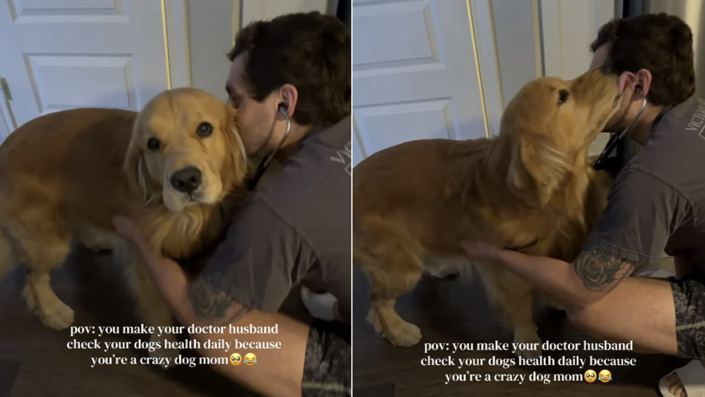 The Instagram video began by giving a closer look at the Golden Retriever dog, Bodie, and his human dad, sitting on the floor. The dad held a stethoscope and checked the dog’s health. In the meantime, the text written over the clip read, “POV: you make your doctor husband check your dogs health daily because you’re a (word) dog mom.”