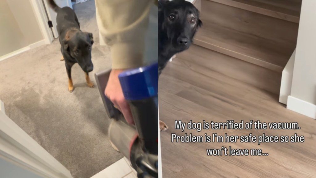 The dog is terrified of the vacuum, but her mom is her safe place, and she won’t leave her side either. So, even with all that noise and movement, she sticks around. Nervous, yes. But also completely sure about where she needs to be.