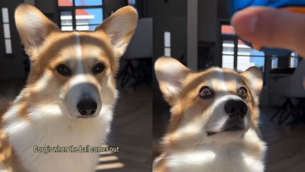 The on-screen text quips, “Corgis when the ball comes out.” And for a moment, the Corgi looks so serious when his owner holds up the ball that he barely seems to blink. As the caption under the video says, he is “locked in.”